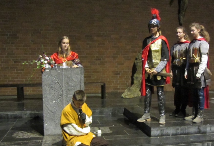 Mit diesen Fragen leitet der berühmte und doch namenlose Bettler den Auftritt von St. Martin ein. Dieser betritt gerade mit zwei weiteren Legionären die „Bühne“. Gebannt konzentrieren sich nahezu einhundert Kinder - und Eltern bzw. Großeltern – auf das Geschehen im Altarraum der Seeheimer Hl. Geist-Kirche. Denn dort setzen Schülerinnen und Schüler unserer Oberstufe die legendäre Begegnung des römischen Reiters Martin mit dem Bettler in Szene.
